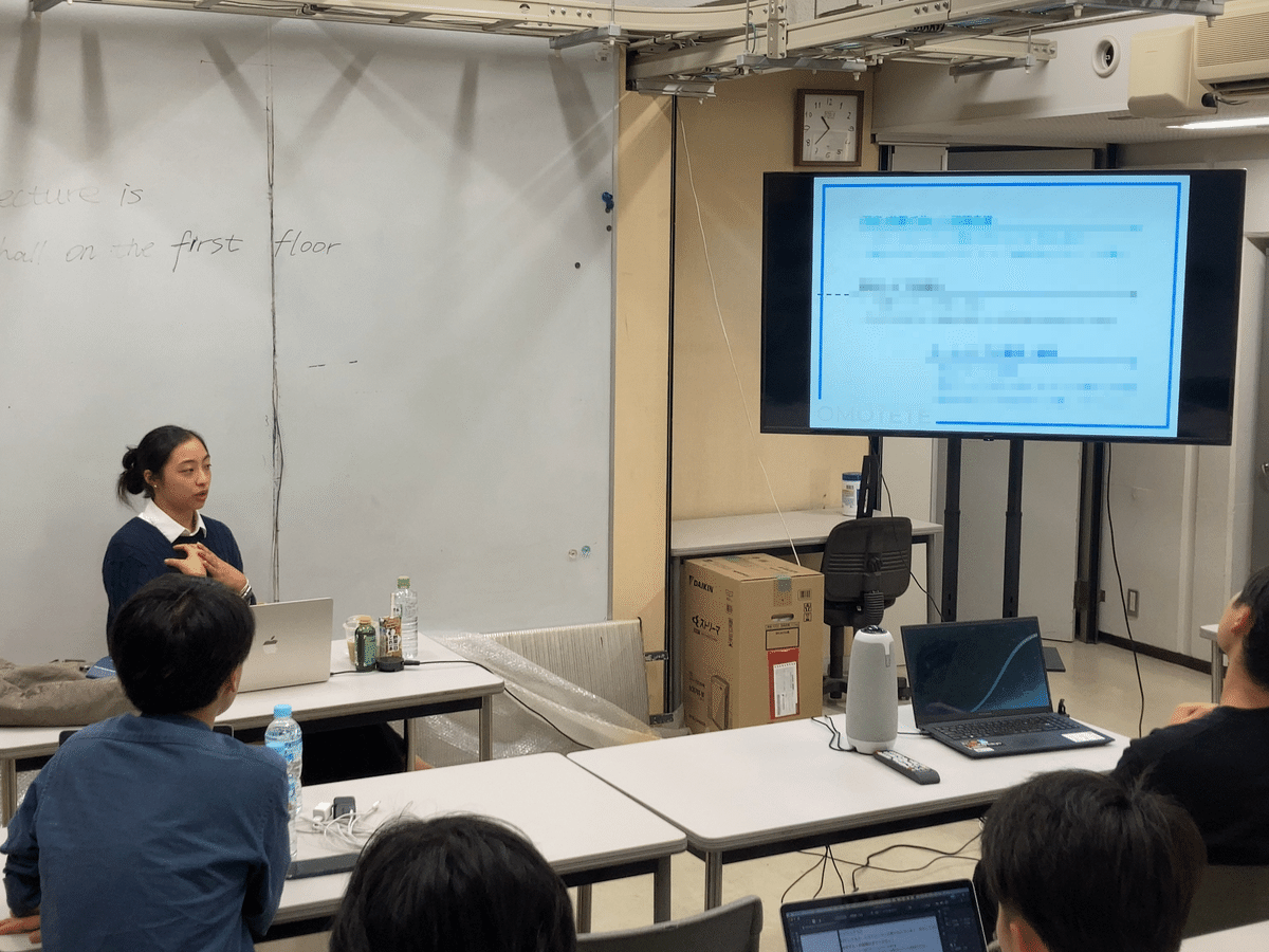ゲストレクチャーに登壇してくださったのは、オモテテ株式会社の設立者で代表を務める高堰 うららさん。うららさんは東京大学大学院博士課程在学中に、駅や商業施設といった公共空間で取得できる生理用品の拡充を目指して、事業の立ち上げを行いました。外出先で突然生理が起こるかもしれない不便さを解消し、「女性のモビリティ」の向上を目標に事業をスタートさせたうららさんは、まず身近な知り合いや協力者を頼りに、アンケートやヒアリングを行いました。足を動かして顧客の不満・憤りを調査し、課題の発見、そして仮説の検証を行うといったプロセスは、事業化を目指す現在の私たちにそのまま重なります。朗らかな語り口調とは裏腹に、その圧倒的な行動力と実行力に、レクチャーをきいた誰もが感化されたのではないでしょうか。