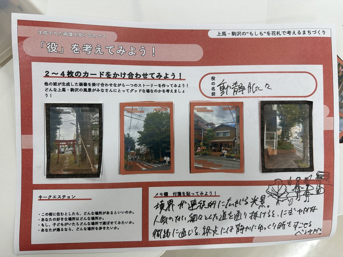 参加者は街歩きを通して、上馬・駒沢のなかに潜む日常の風景や記憶、季節の気配などを写真に収めつつ、その場所の思い出や感じたことを音声で吹き込みます。その後、撮影した写真をもとに、吹き込まれた音声を分析したAIが生成する上馬の地域花札をもとに議論を重ね、そこに物語や意味を付与していきます。