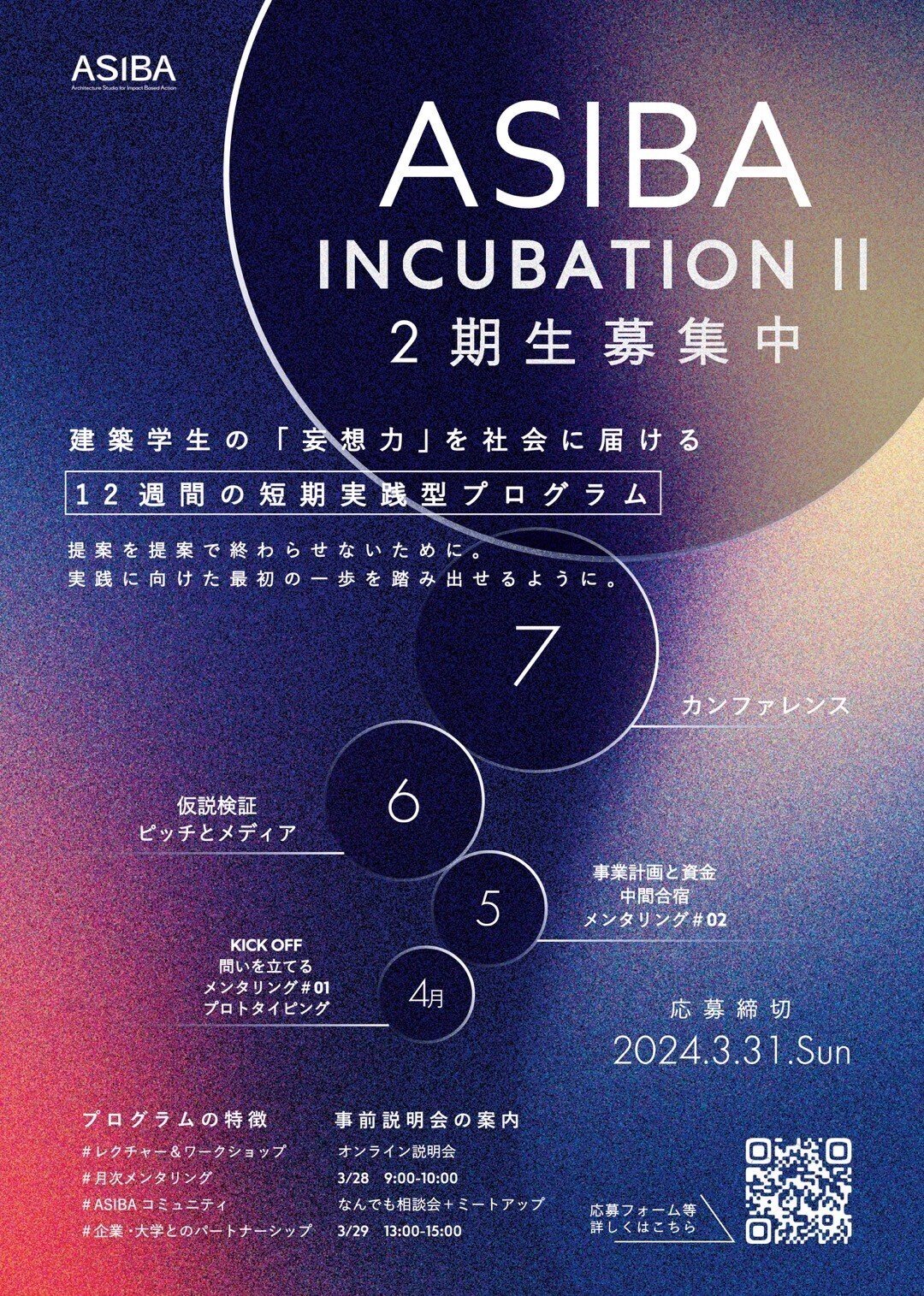 建築学生の提案を形にするための12週間のインキュベーションプログラムASIBAは、4月から第2期を開講します!設計製図の提案を提案で終わらせたくない人、修士で追ってきたテーマを修士で形にしてみたい人、とにかく手を動かしてみたい人、社会に対して自分で挑戦したい人、ぜひ参加してみてください。