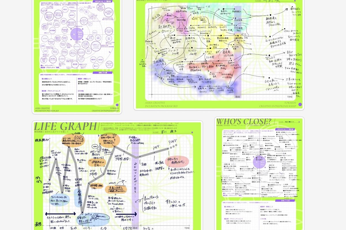 - ライフグラフ:自分が生まれてから現在、そして未来までの人生をグラフとして表現し、プロジェクトが生まれたきっかけや未来への思いを深掘るワーク