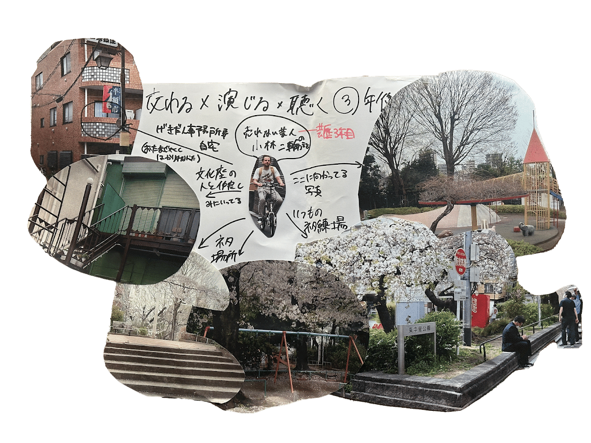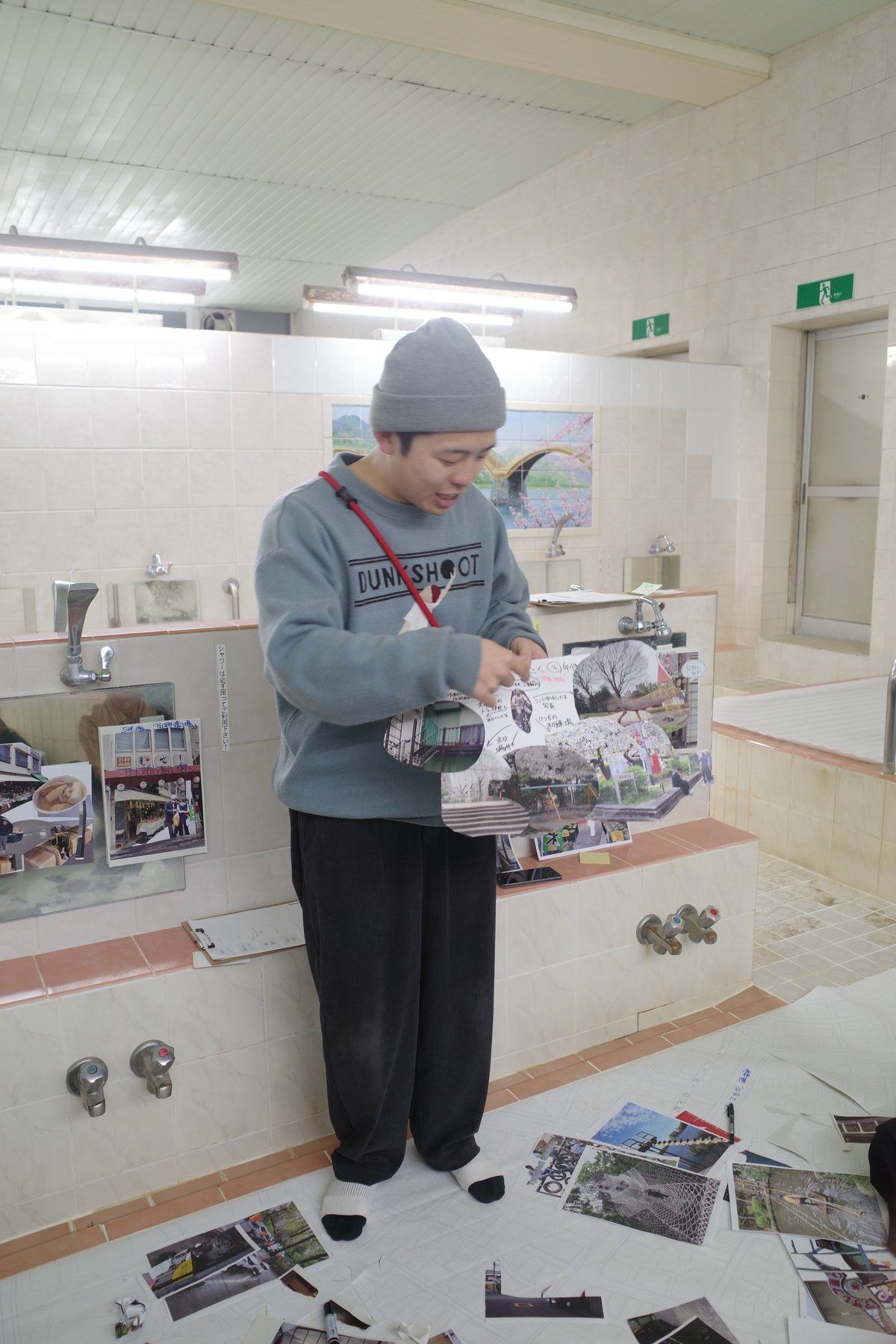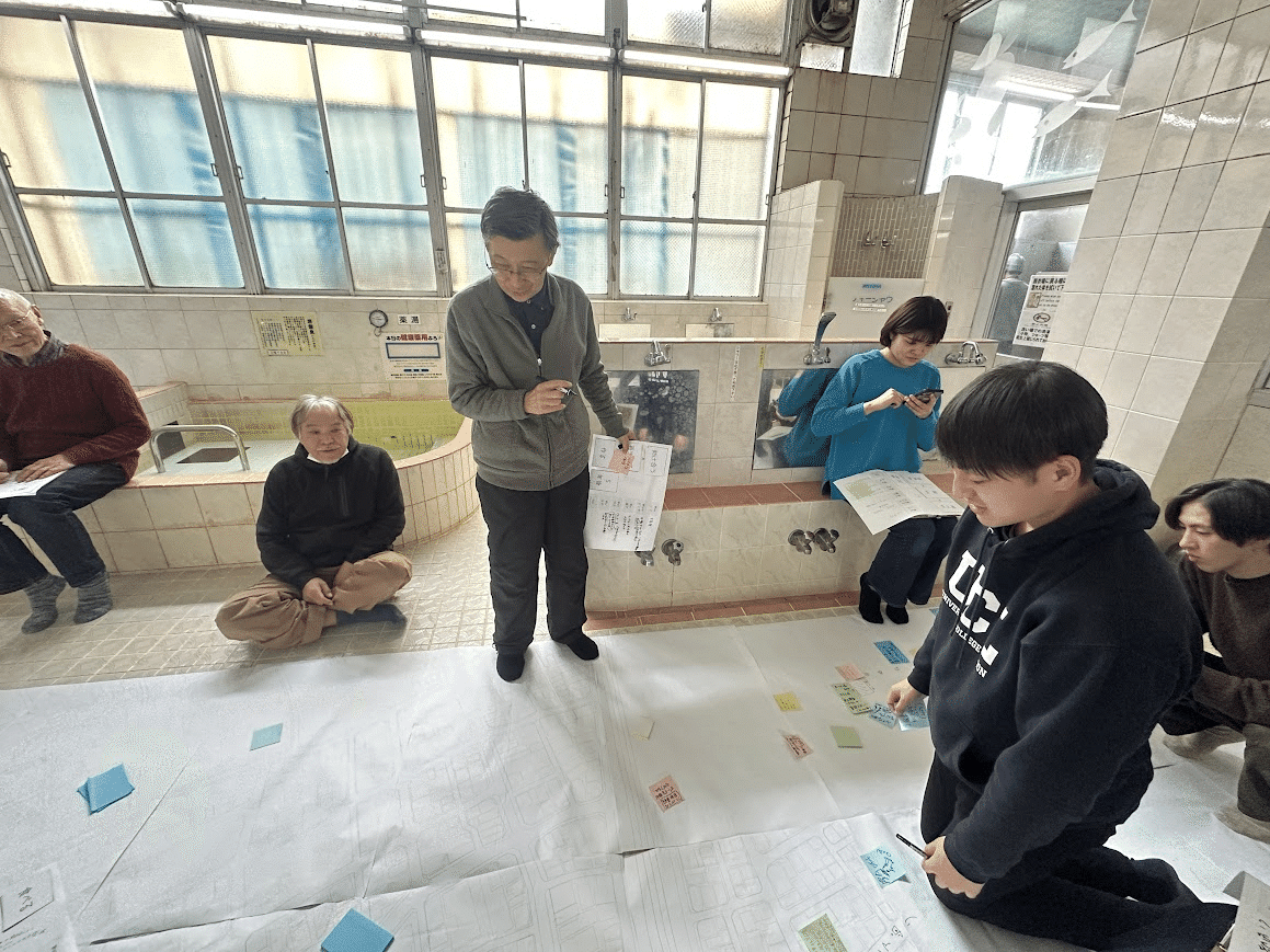 2025年3月31日、田端銀座商店街の銭湯「松の湯」にてTokyo Futurescape Studio #01 「暗渠商店街×風景コラージュ」を開催しました。建築系の学生や地元の方々など合計約20名が参加し、銭湯に地図と写真を広げながら、コラージュで未来の風景を制作していきました。