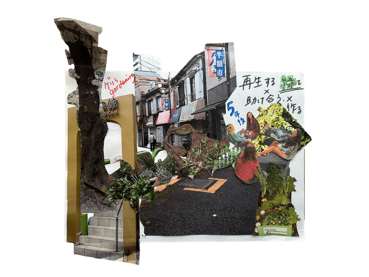 コラージュを作る中で街に「緑」が少ないことに注目。商店街の路肩で植物を栽培することで、緑を介して「作る」「助け合う」行為が生まれ、緑も街も再生されていく景色を制作した。