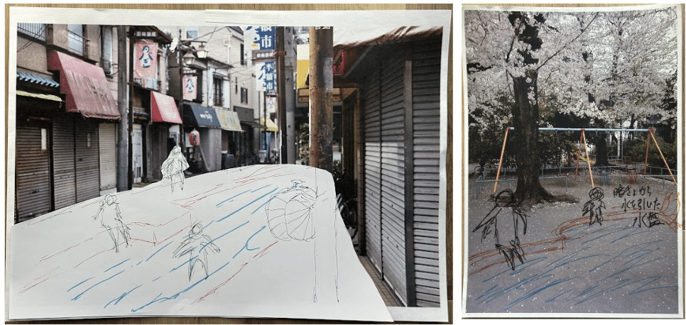 風呂庭ワークショップでは、一面地図を貼った銭湯の中で、フィールドワーク中に撮影した写真を切り貼りし、未来冒険ワークショップで考えたストーリーをコラージュによって表現しました。