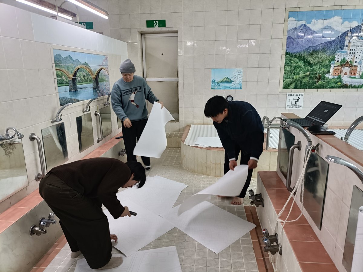 まずはアイスブレイクとして、松の湯の浴場に駒込エリアの1/250スケールの巨大地図を貼り合わせていきました。本来は運営チームが貼る予定でしたが、A1版25枚に及ぶ巨大地図を前にして配置が分からなくなってしまい、急遽参加者全員でアイスブレイクを兼ねて実施することになりました。