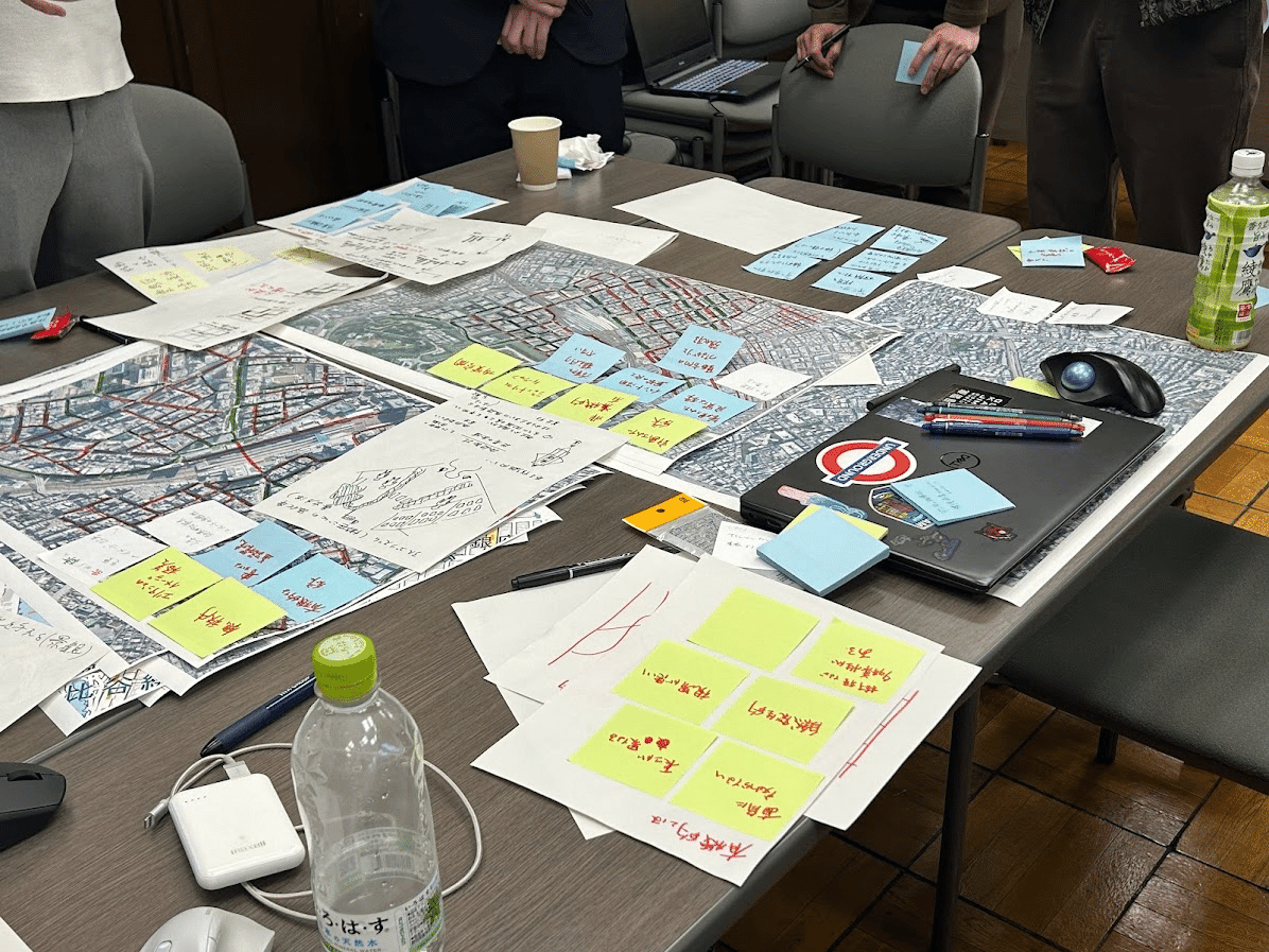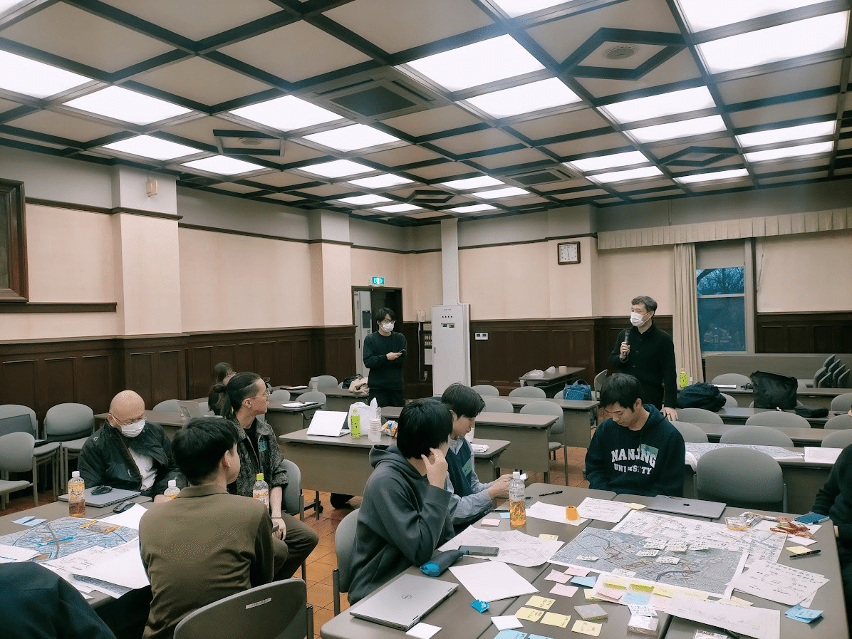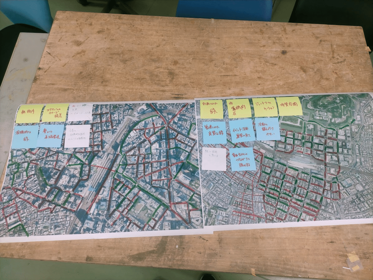 各班での議論が白熱してきたところで,先生方を含め順に各班の考えの方針をお互いに発表しました.同じエリアを選んでいても,班によってどのようにウォーカブルとデータを結びつけていくのか,都市の中のどの要素に着目するのかなど,異なる視点を持っていました.お互いの考えを客観的に捉えるとともに,より深い考えになるように率直な意見を出し合う機会となりました.