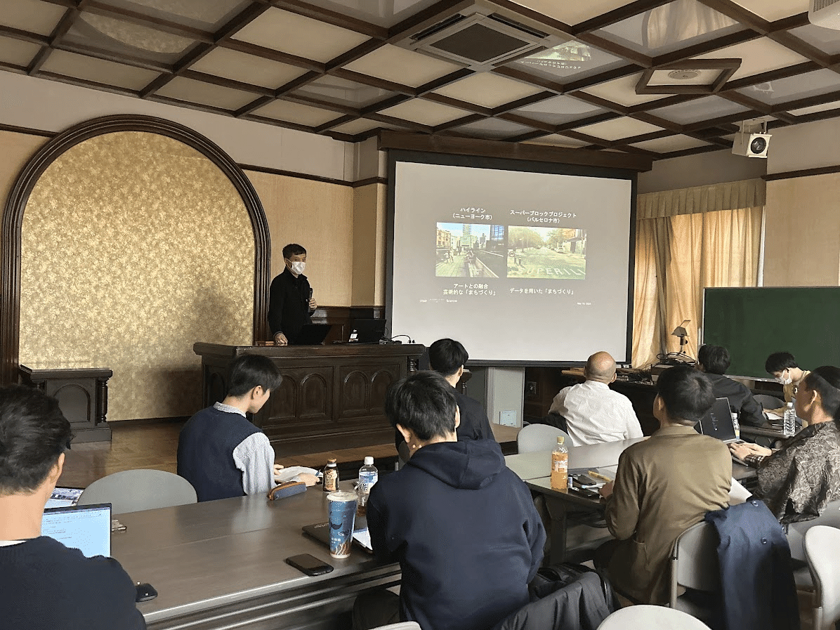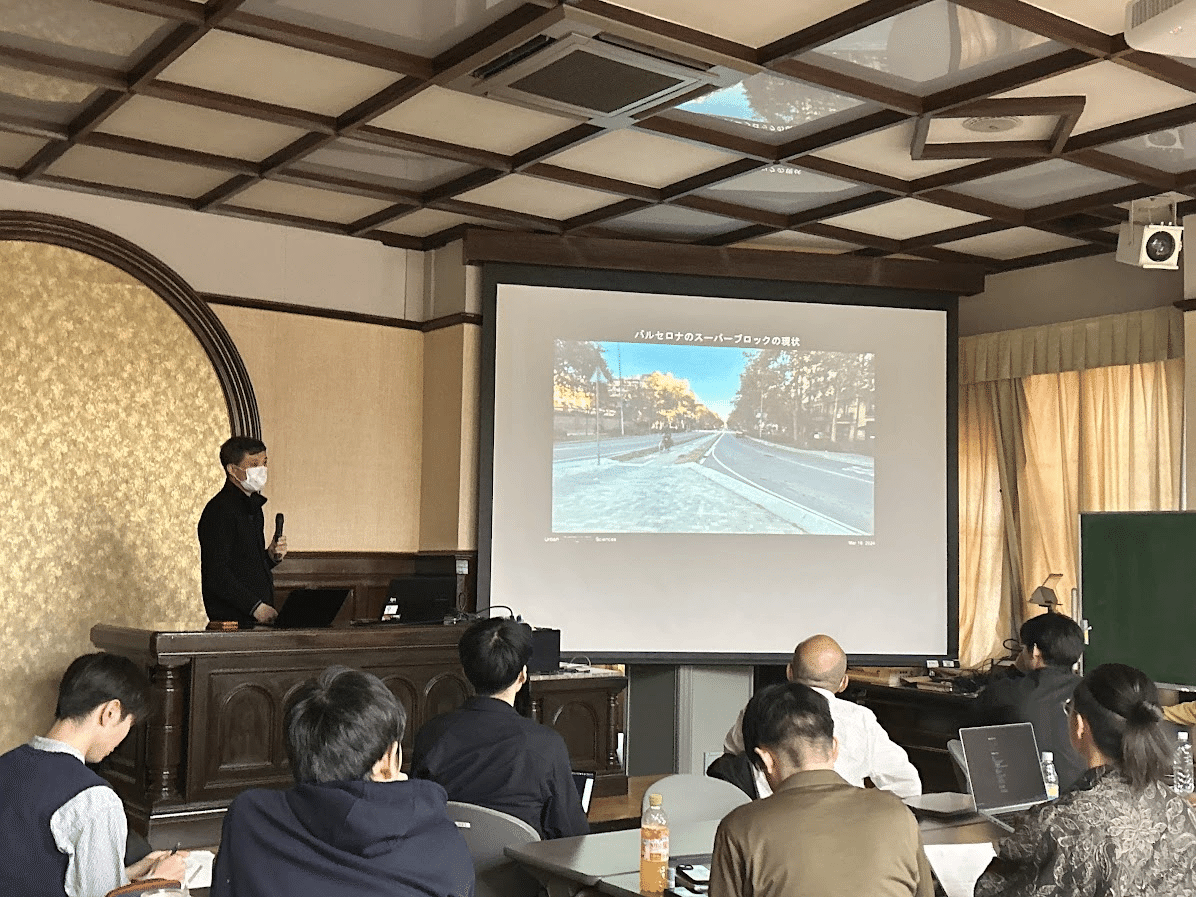 まずは,アーバンサイエンスについての研究をされている吉村先生によるレクチャーが行われました.ウォーカブルが積極的に推進されているバルセロナを例に,都市データを基とする街づくりについて解説していただきました.バルセロナはデータを用いた街づくりが活発で,スーパーブロック政策による歩行者空間化が行われています.グラシア地区から始まった計画がバルセロナ全体へと広がり,歩行者中心のまちづくりが推進されました.また,その歩行者空間化による交通網の再整備や,小売店の売り上げとの関係性についてもご説明をいただきました.データを用いてウォーカブルという抽象的な概念の有用性や多側面との関連性が示されていくことはとても学びのあるものでした.