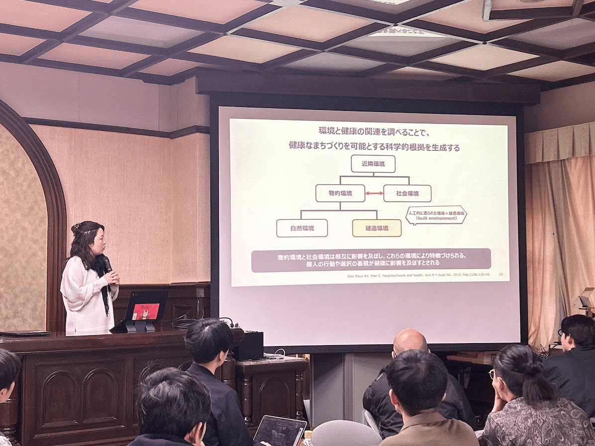 次に,街づくりと健康の可能性について研究をされている古賀先生からもレクチャーをいただきました.健康には,生活リズムや遺伝的要素といった個人的要因に加え,その人を取り巻く環境的要因がが強く依存してきます.地域環境の整備など個人の努力に依存しない予防の仕方を「0次予防」といい,その予防を推進するにあたってウォーカブル化が有用であるということを,研究データを用いて説明していただきました.ウォーカブルな地域と認知症割合との関係性,緑地割合とうつの関連性などとても興味深い内容でした.