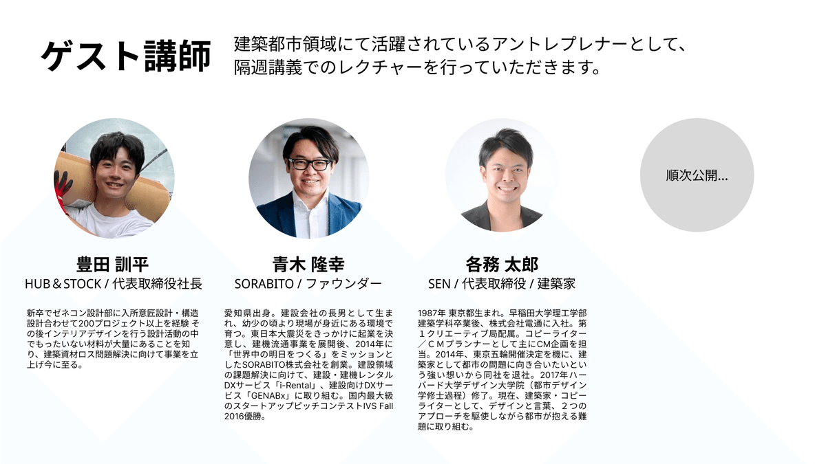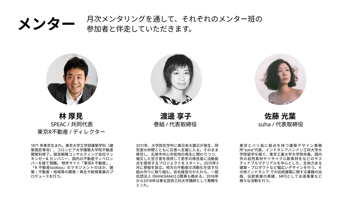 建築・都市領域において最先端で活躍されているアントレプレナーの大先輩方にお越しいただき、メンタリングやレクチャーを行なっていただきます。 実装のための技術や知識だけでなく、新たな道を歩むための姿勢の体得なども含めて、挑戦者の背中を押してくれる存在です。
