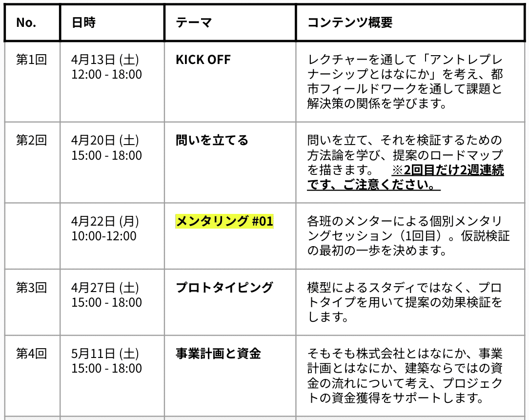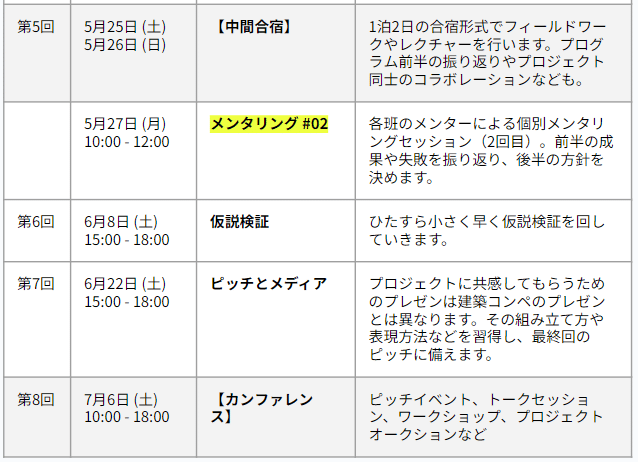 主に2週間に1回(土曜の15:00-18:00)のレクチャー+ワークショップと、月に1回(月曜の10:00-12:00)のメンタリングセッションがあります。実施場所は都内を予定しています。