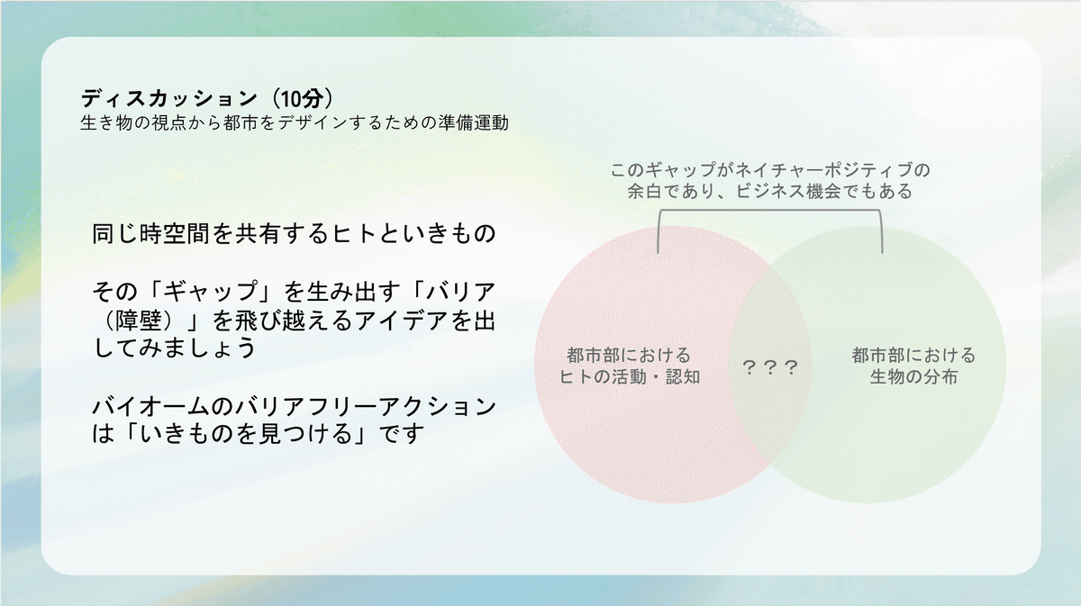 veig 片野さんとバイオームのレクチャーでは一貫して、生態系を人間が扱う際の複雑さや、そこに介入していく際の難しさが論じられていたように思えます。そこで最後に、「生き物の視点から都市をデザインする」ための準備運動として、次のようなお題でディスカッションを行いました。