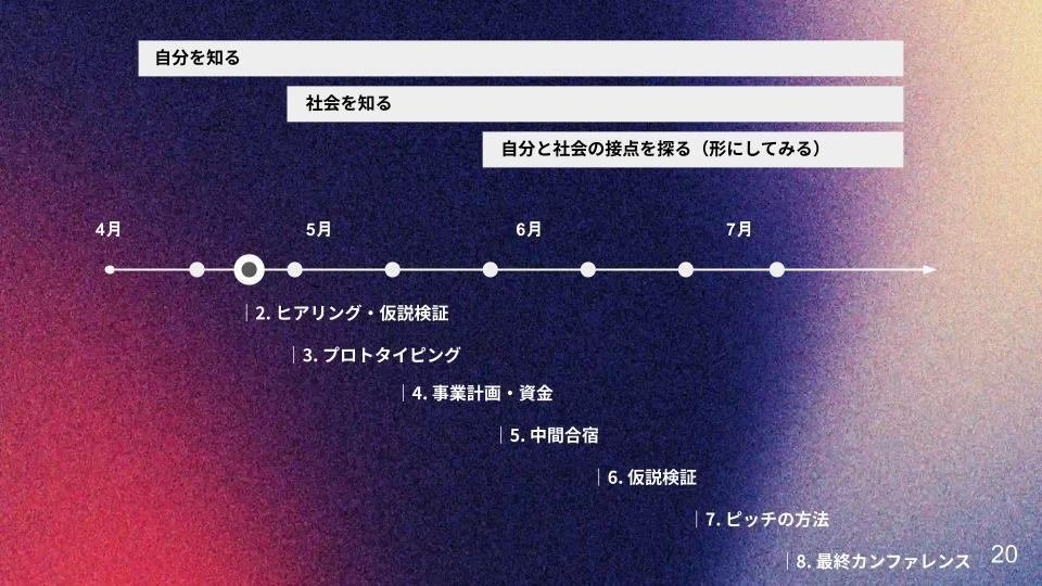 プログラムの最初に、改めてインキュベーションプログラムの目的とストーリーが共有されました。「提案を提案で終わらせないために。実践に向けた最初の一歩を踏み出せるように。」これを胸に刻み、3ヶ月間仲間と共に走りきろう、と全体の士気が高まりました。 それを実現するためには、隔週で集まるこうしたインプットの時間よりも、ヒアリングに駆け回り、考えたアイデアを形にする、プログラム時間外での各々の取り組みこそが大切であるということも事実です。自ら行動し、体現し、検証を重ねることを最も重視してほしい、と語りました。