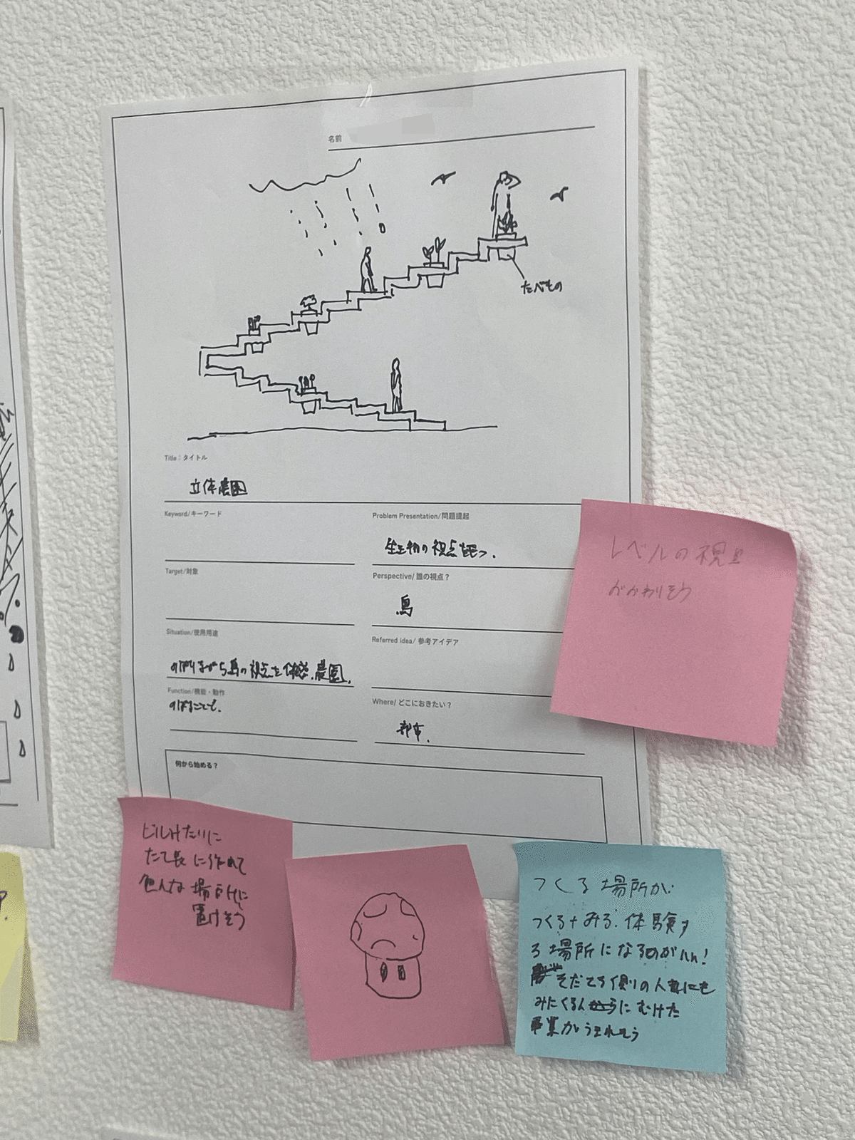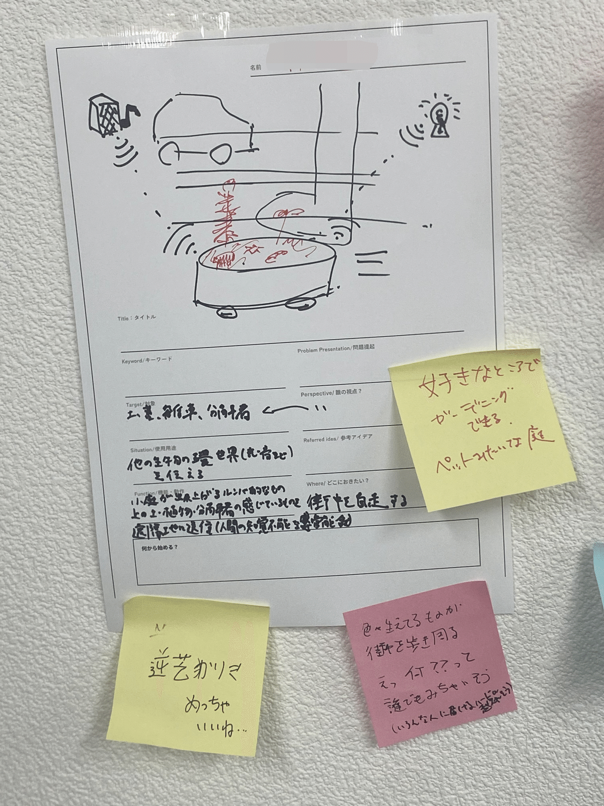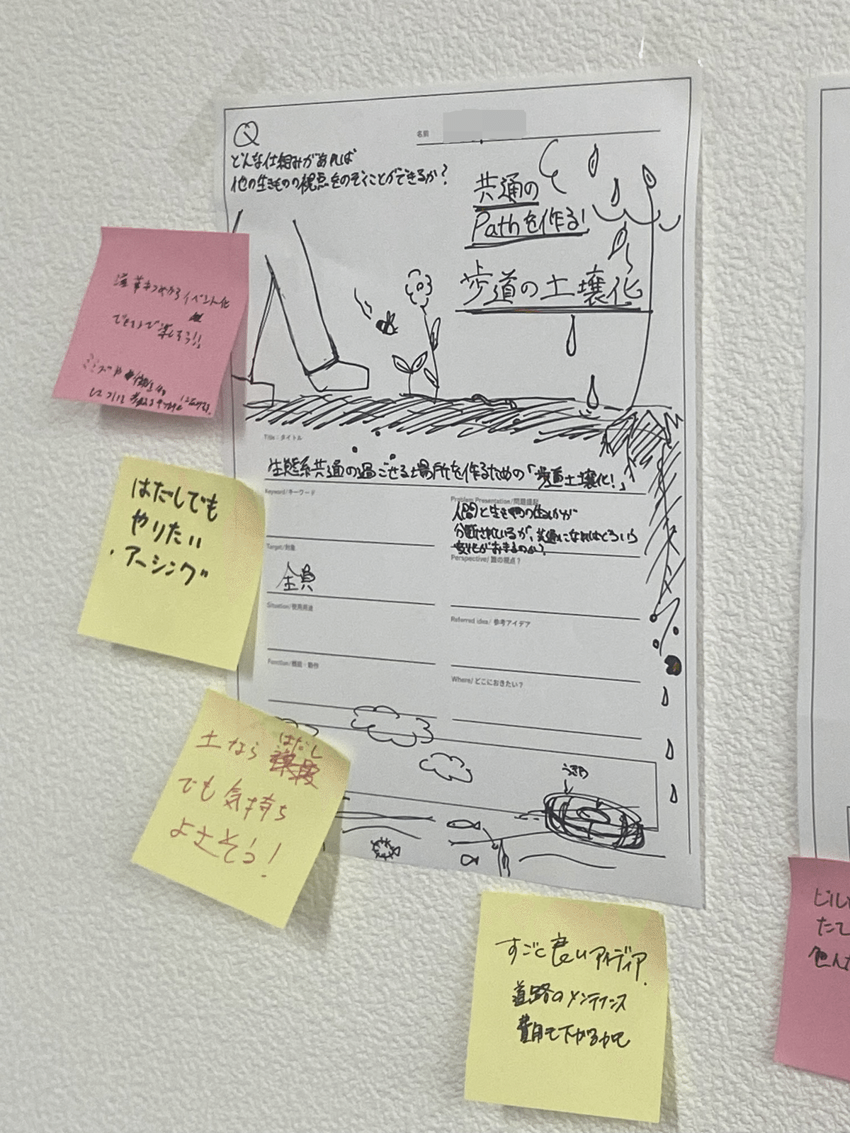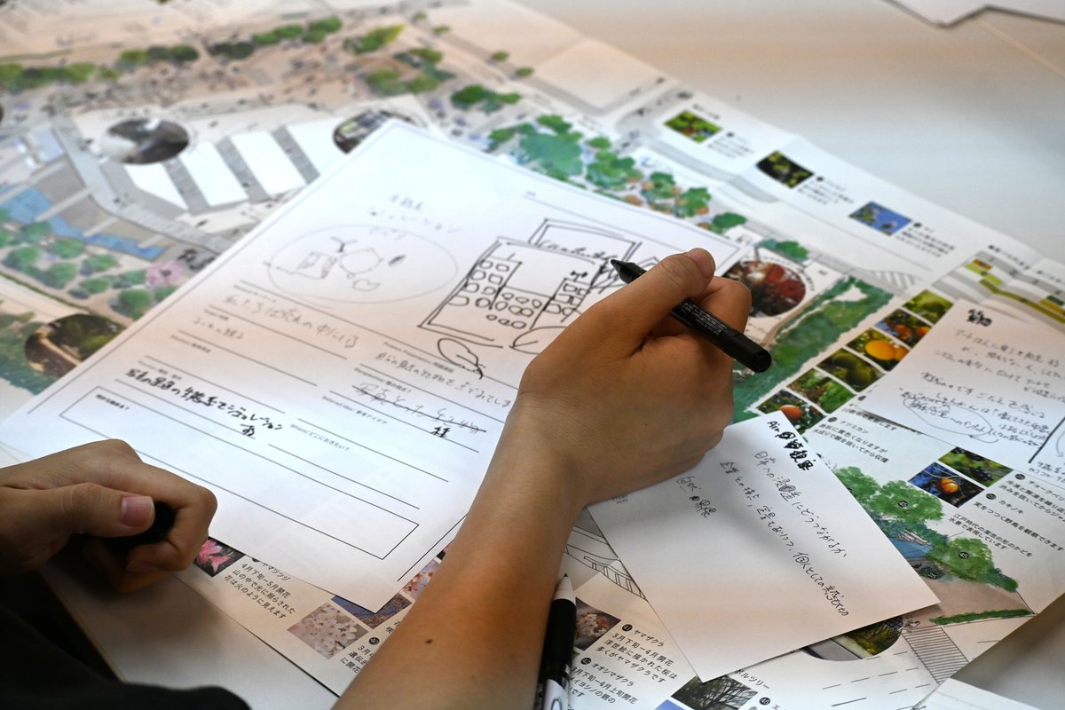 敷地見学のあとは、本プログラムのテーマに即して最初のアイデア出し・ディスカッションを行いました。お題は、「他の生き物たちの視点から都市を覗くための仕組みやデザインとは?」 生物多様性やネイチャーポジティブなど、生き物に関わるどんな施策も、「人間と生き物では見え方や感じ方が違う」という根本的な前提を忘れてはなりません。