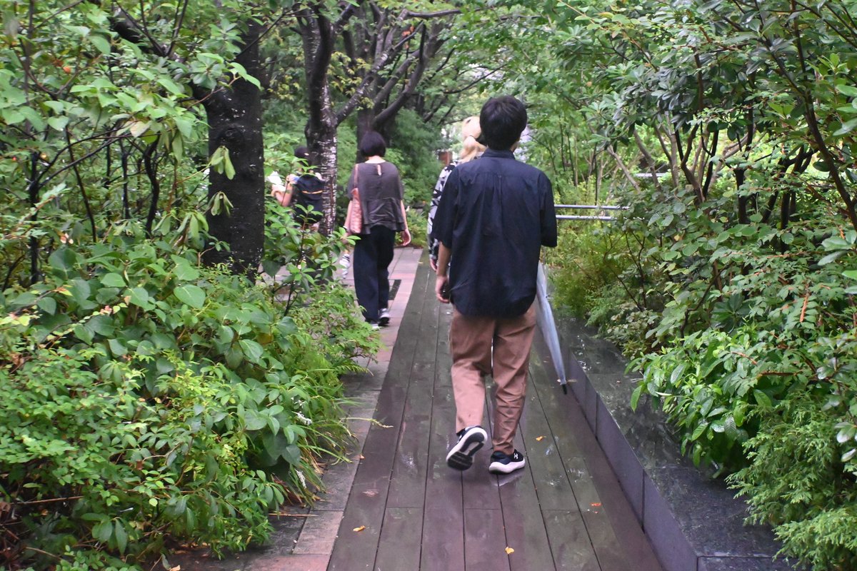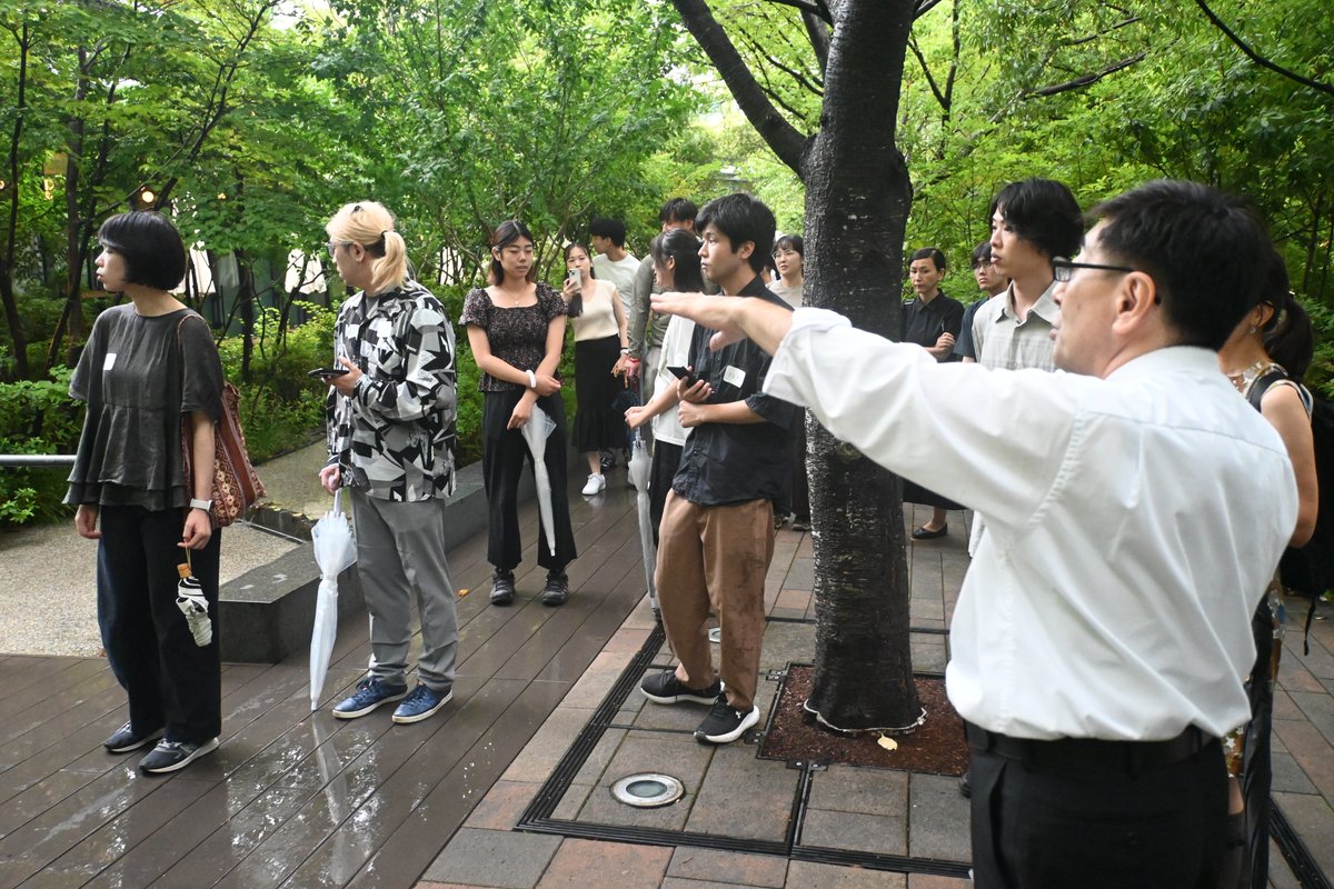 イベント後半には天気が回復し、日鉄興和不動産の担当者様の解説のもと、本プログラムを通しての敷地である赤坂インターシティAirの緑道を歩きました。 かつて江戸時代の溜池の南東を縁取っていた形状に由来するというこの敷地は、大規模なビルが立ち並ぶ東京の中心地にも関わらず、5,000㎡を超える緑化空間を有しており、都市における生き物との共生を考えるうえで、大きな手掛かりとなる場所です。 都心の庭園としては珍しい植物が多く生息しており、中庭にはみかんが植えられていたりと、敷地におけるこれまでの取り組みや、魅力に気づかされました。
