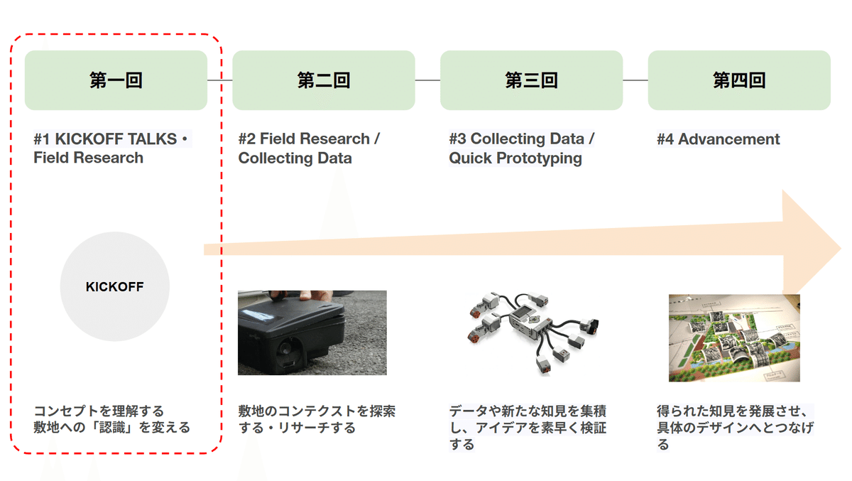#2 9月26日 15:00-18:00 Field Research / Collecting Data|敷地のコンテクストを探索する・リサーチする #3 10月9日 15:00-18:00 Collecting Data / Quick Prototyping|データや新たな知見を集積し、アイデアを素早く検証する #4 10月22日 15:00-18:00 Advancement|得られた知見を発展させ、具体のデザインへとつなげる