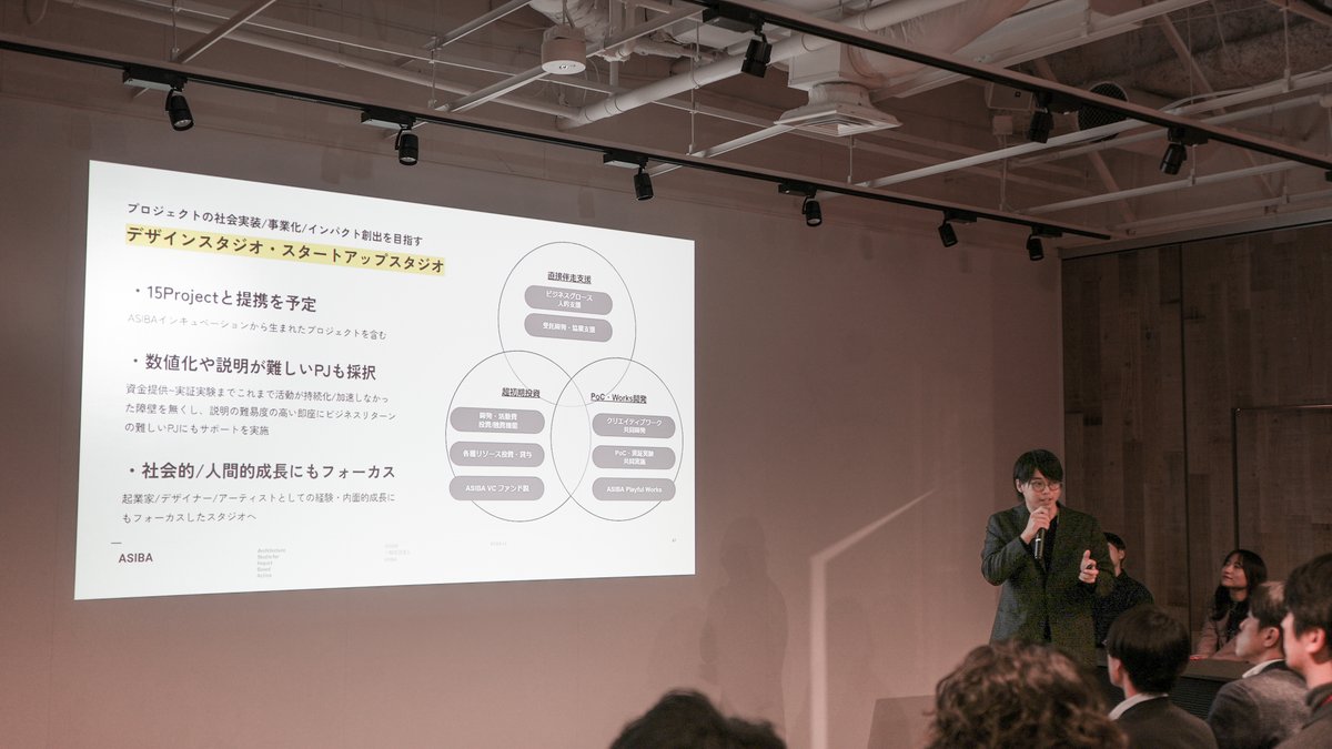 ASIBAが発足して1年半、私たちは「建築・デザイン・アート」の可能性を信じ、若者のアイデアを実社会で形にする活動を続けてきました。 イベントの第一部では、代表の二瓶がこれまでの軌跡を、理事の森原が今後の展開についてご説明しました。