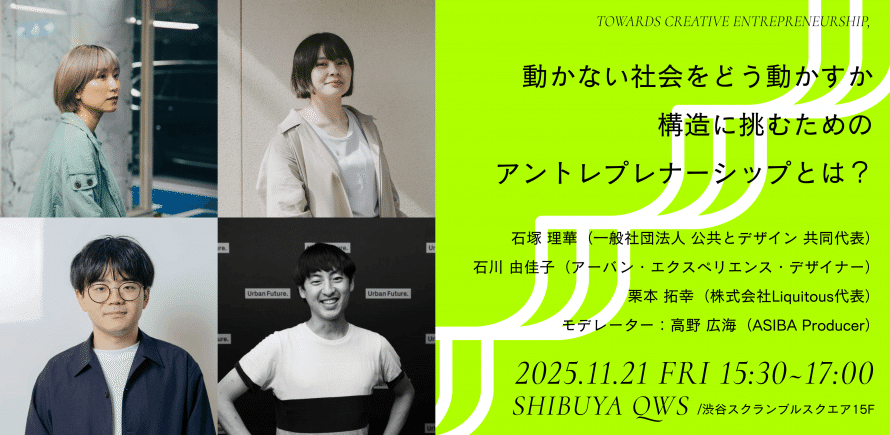 創造的な社会を、ここからデザインしていくために。 さあ、一緒に議論を始めよう。 日程:2025年11月21日(金) 13:00-20:40 主催:ASIBA、@カマタ 協力:一般社団法人デサイロ 後援:NPO法人ETIC. 会場:SHIBUYA QWS(渋谷スクランブルスクエア15F) 定員:各セッション最大50名/途中入退場可能 お申し込み:https://creative-entre.peatix.com/view