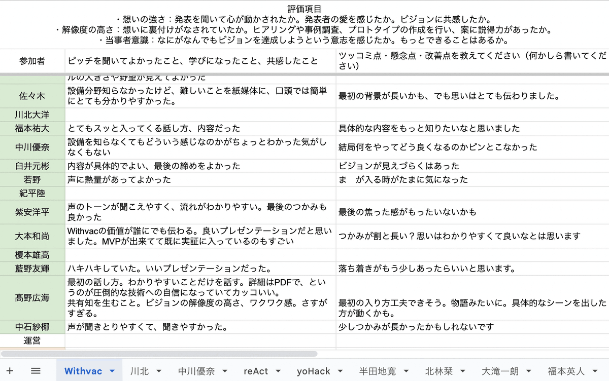 想いの強さ:発表を聞いて心が動かされたか。発表者の愛を感じたか。ビジョンに共感したか。 解像度の高さ:想いに裏付けがなされていたか。ヒアリングや事例調査、プロトタイプの作成を行い、案に説得力があったか。 当事者意識:なにがなんでもビジョンを達成しようという意志を感じたか。もっとできることはあるか。