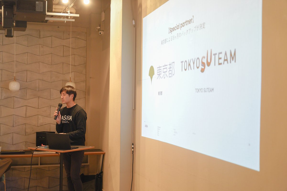 ASIBA事務局の二瓶、森原、髙野の3名から2年目を迎えるASIBAについてのプレゼンテーションが行われました。 二瓶からは、ASIBA発足当初からこれまで行ってきたワークショップやインキュベーションを含む1年間の総括を。 森原からは、ASIBAのリブランディングやバリューについて。 そして髙野からは、東京都に選出いただいたスタートアップ支援展開事業「TOKYO SUTEAM」や今後の行政との連携について。