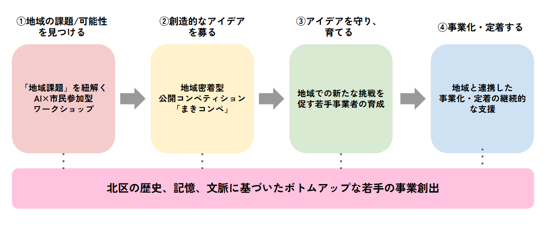 以上2点を、既にコンペを開催している暗渠商店街エリアを含む、北区内の複数個所で実施します。北区産業振興課と連携し、特に地元の商店街と連携してプロジェクトを推進します。