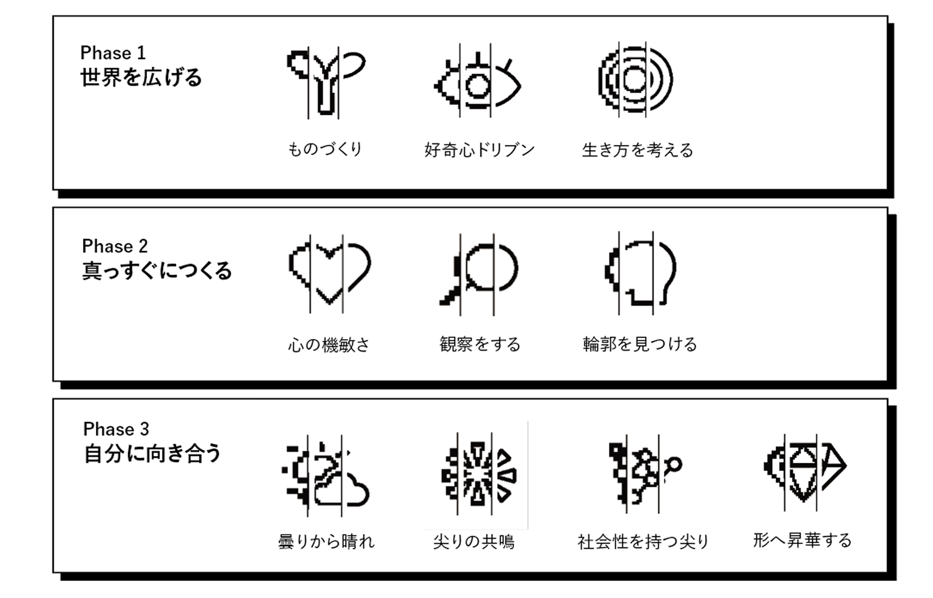 プログラムは「世界を広げる」「自分と向き合う」「真っすぐにつくる」の3フェーズで進行します。第一線で実践を続ける若手クリエイターをメンターに迎え、対話やプロトタイピングのワークショップを重ねます。「何をどうつくるか」という技術論にとどまらず、「これからどう生きたいか」という根源的な哲学にまで潜り込み、事業と表現の狭間で葛藤する同世代の仲間とともに、自分だけのクリエイションの形を模索します。