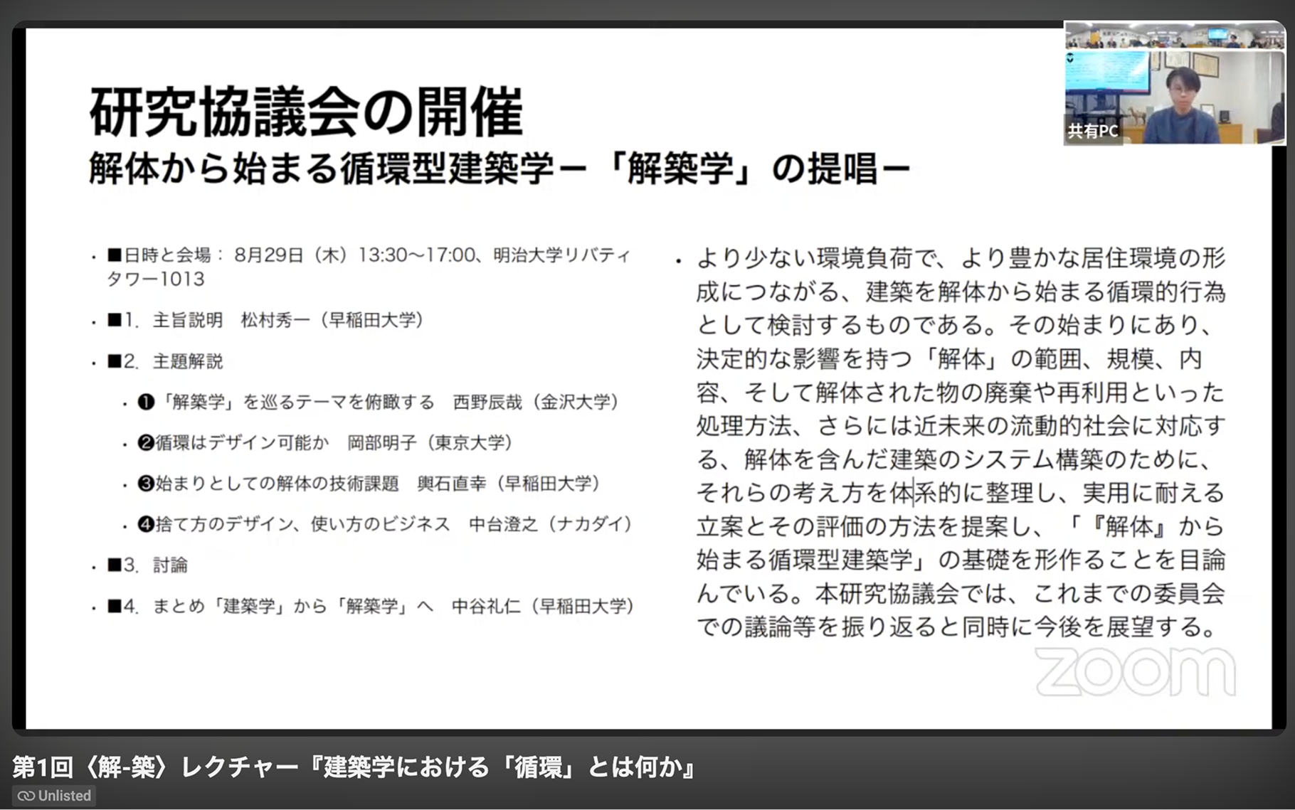 これまで建築は「新しく建てる」ことが前提とされてきましたが、本研究会では「解いて、築く(解体から始まる循環)」という新たなパラダイムから建築学の再構築を目指しています。多様な分野の専門家が集うこの実践的な場において、ASIBAは研究会全体のプロジェクトマネジメント(PM)を担当しています。