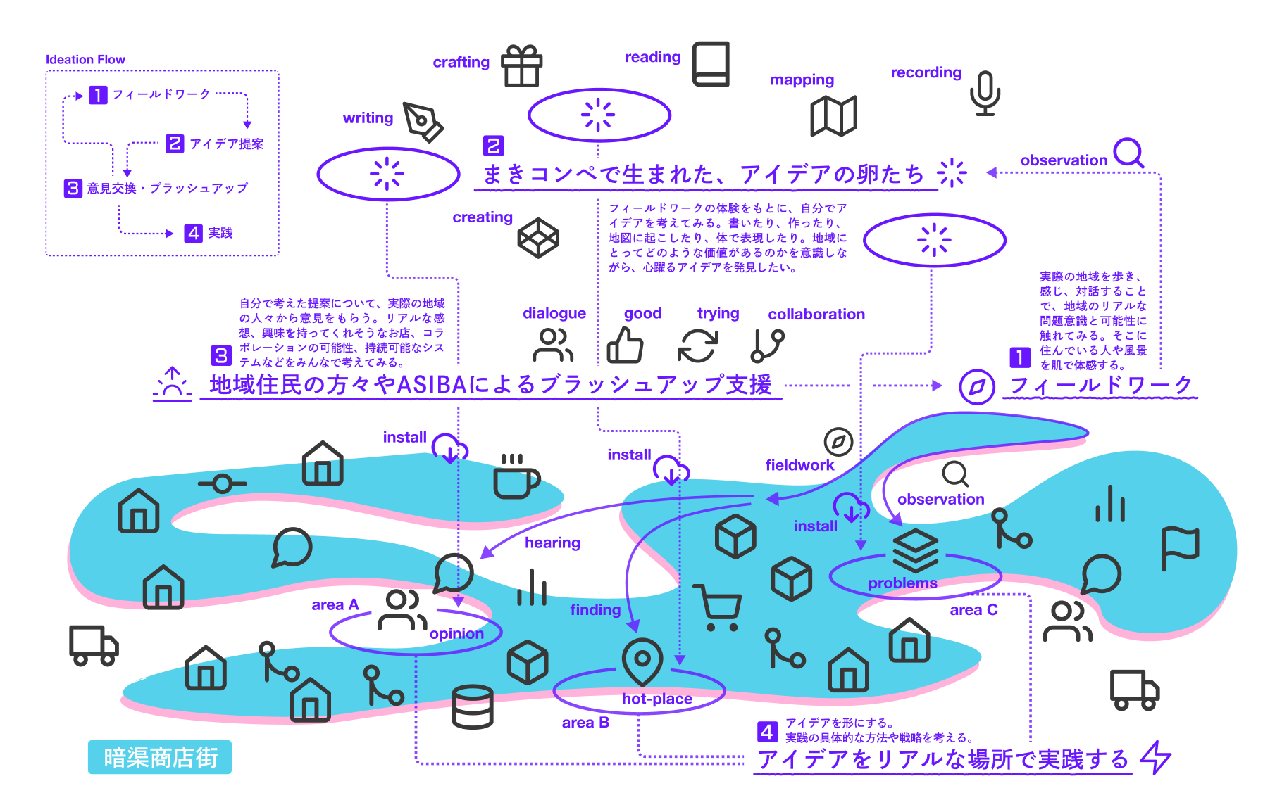 舞台となるのは、かつて川が流れ、現在はフタをされた「暗渠」の上に広がる商店街。見えなくなった水脈は、今も地形の起伏や道の形として都市にひっそりと息づいています。本プログラムでは、商店街を単なる買い物の場ではなく、この「見えない川の流れ」という一つのまとまりとして捉え直します。地域の記憶を掘り起こし、停滞しつつある街に新たな「流れ」と「溢れ」を生み出す空間や制度のアイデアを広く募集しました。